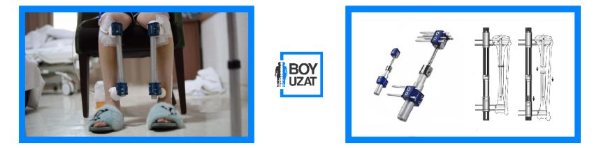 Aşağıdaki resimde de görüldüğü gibi metal kalın çubuklar kemiklere pinlerle sabitlenmiştir. Cihaz hedeflenen boy uzatma miktarına göre 2 ile 3 ay arasında tutulur.